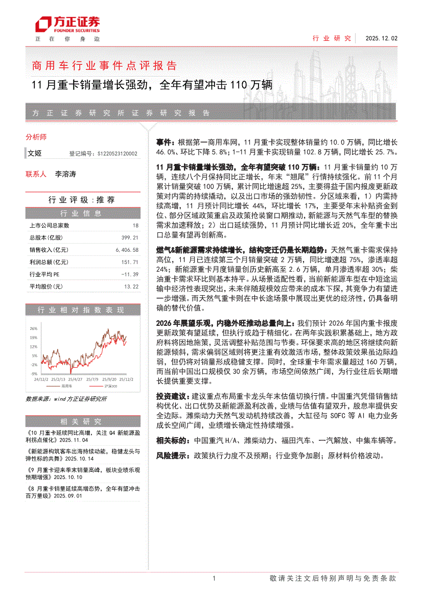商用车行业:方正证券-商用车行业事件点评报告:11月重卡销量增长强劲,全年有望冲击110万辆-251202
