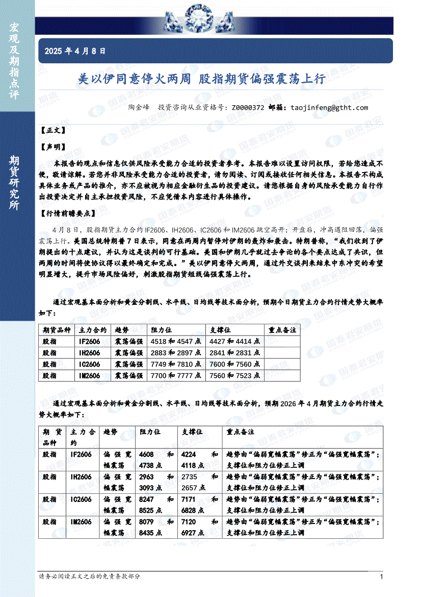 国泰君安期货-美以伊同意停火两周,股指期货偏强震荡上行-260408