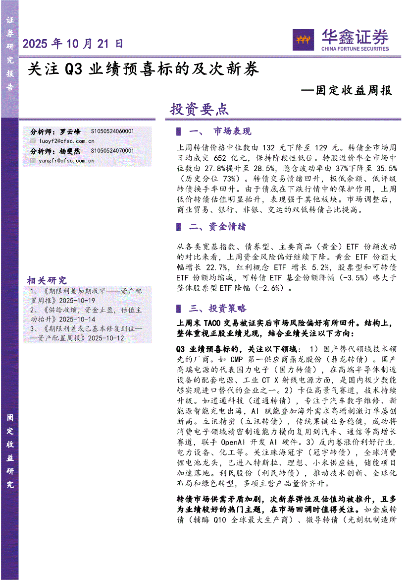华鑫证券-固定收益周报:关注Q3业绩预喜标的及次新券-251021