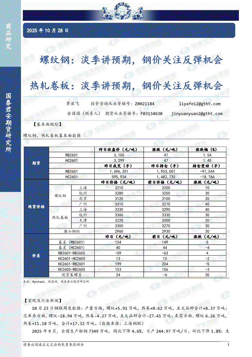 国泰君安期货-螺纹钢:淡季讲预期,钢价关注反弹机会,热轧卷板,淡季讲预期,钢价关注反弹机会-251028