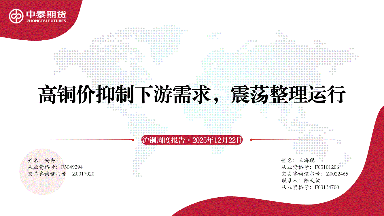 中泰期货-沪铜周度报告:高铜价抑制下游需求,震荡整理运行-251222
