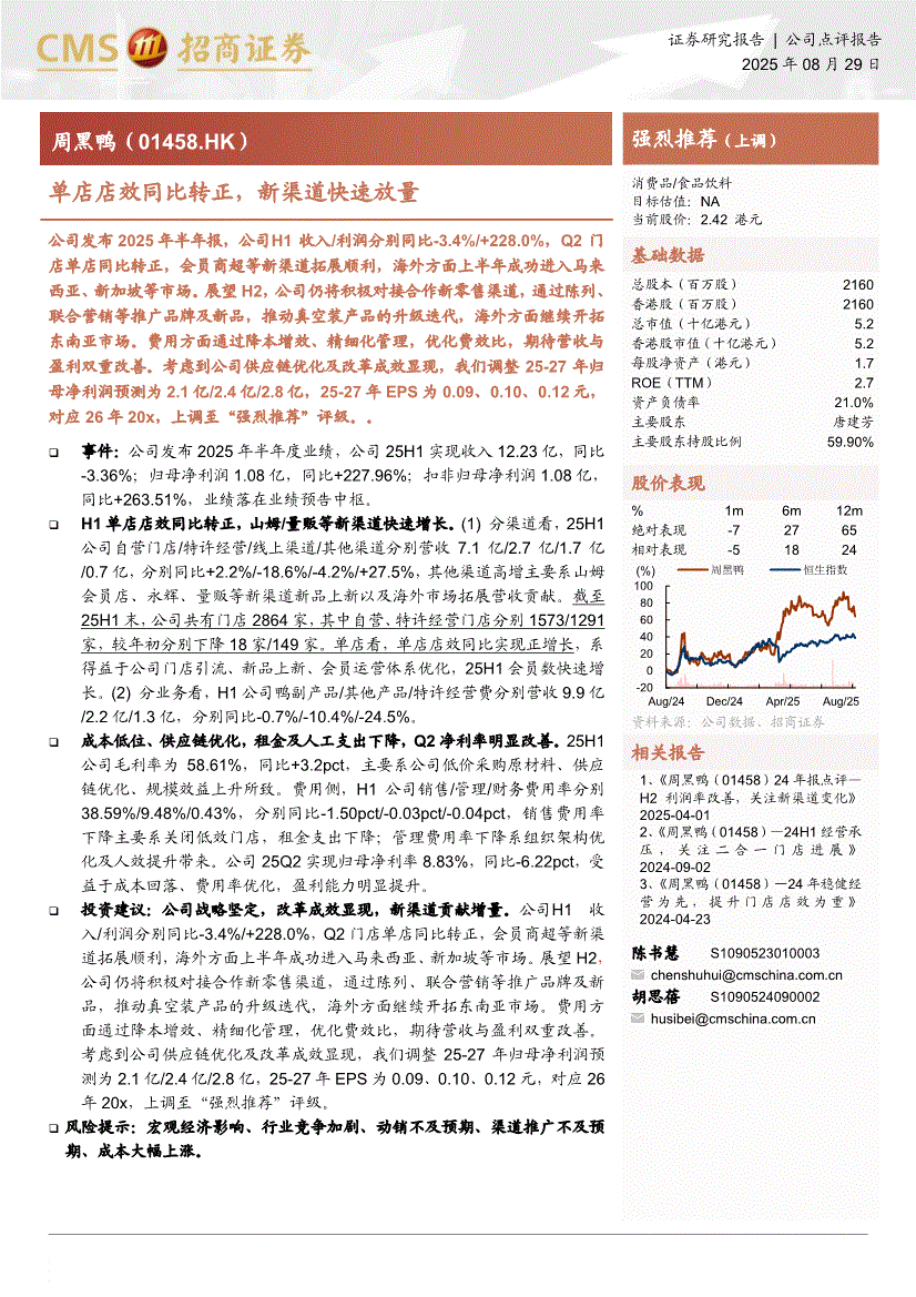 周黑鸭:招商证券-周黑鸭-1458.HK-单店店效同比转正,新渠道快速放量-250829