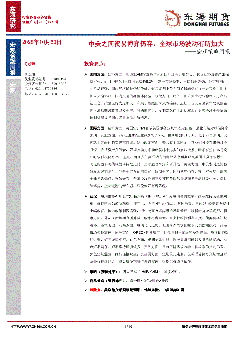东海期货-宏观策略周报:中美之间贸易博弈仍存,全球市场波动有所加大-251020