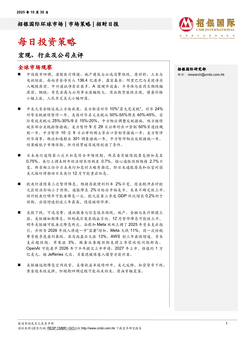 招银国际-招财日报:每日投资策略-251030