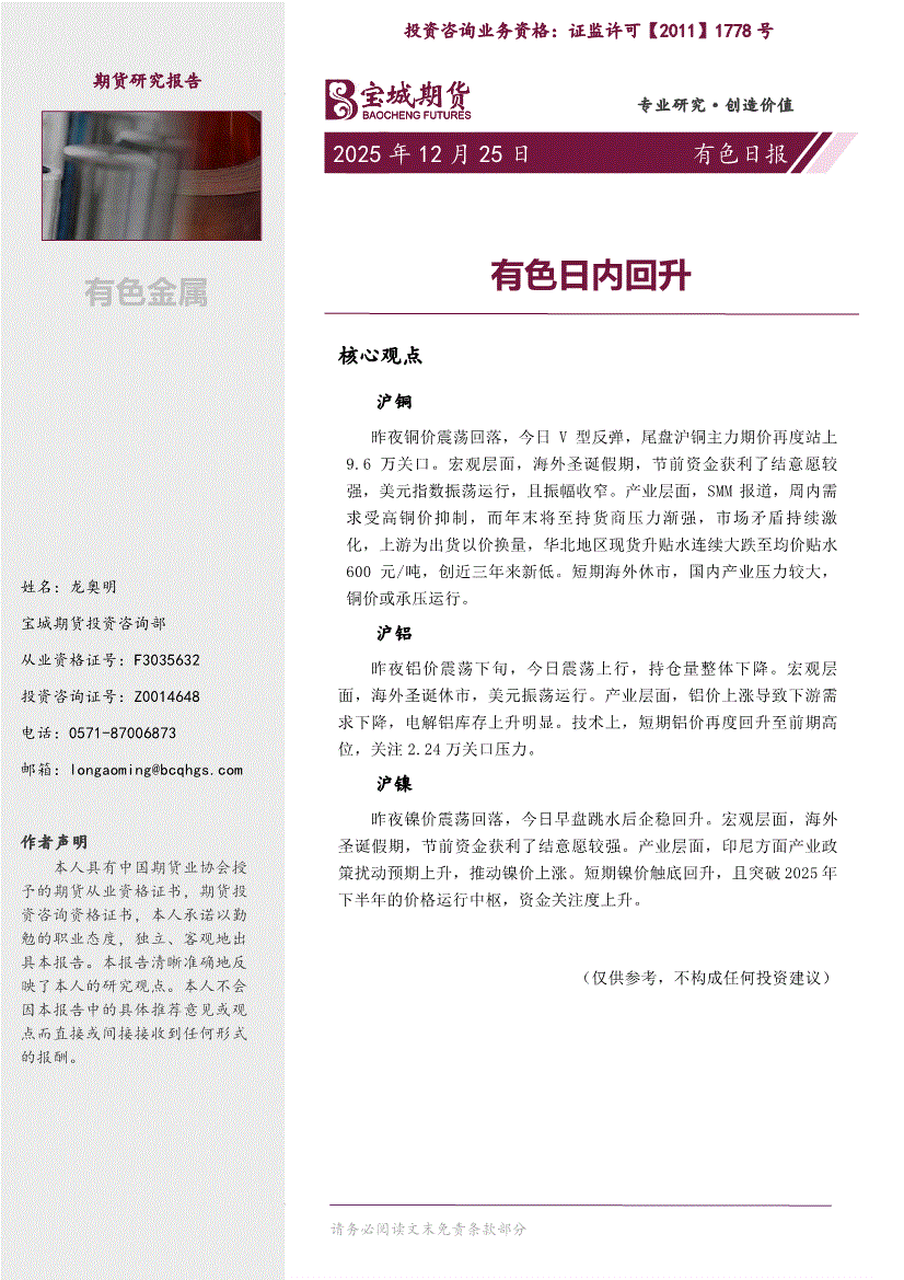 宝城期货-有色日报:有色日内回升-251225