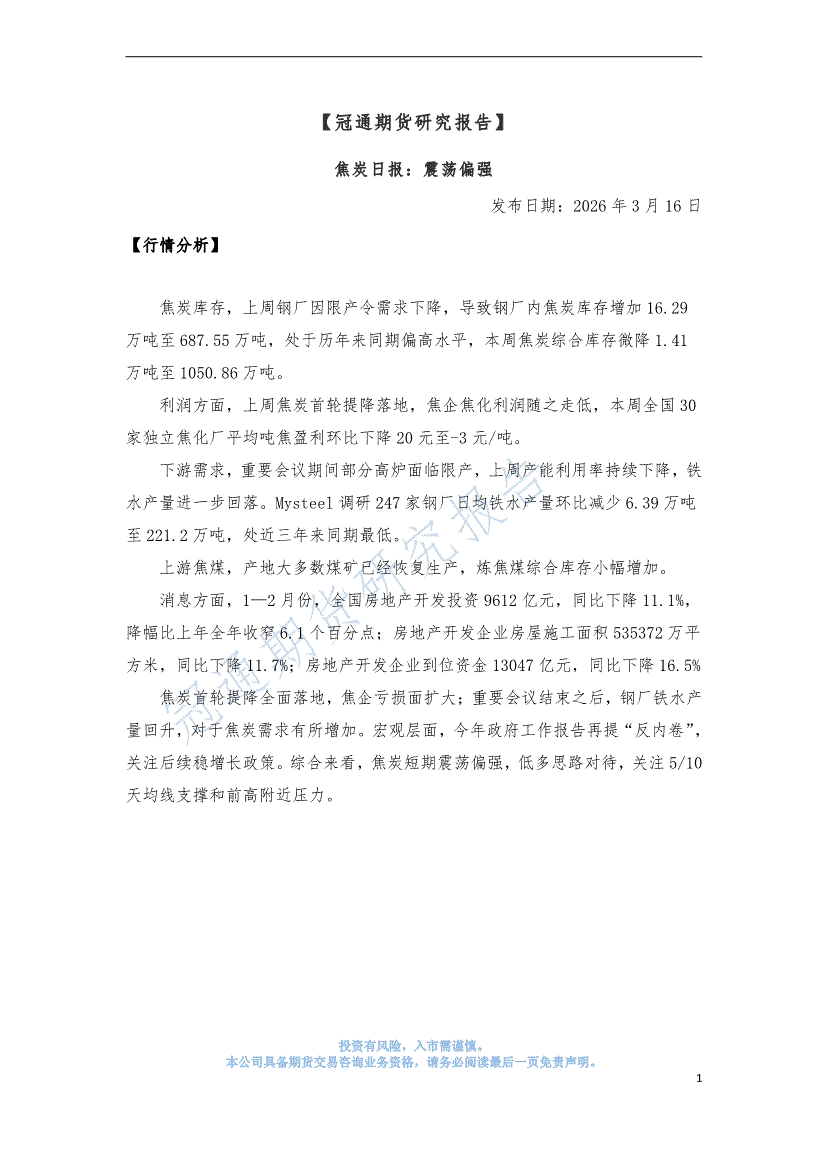 冠通期货-焦炭日报:震荡偏强-260316