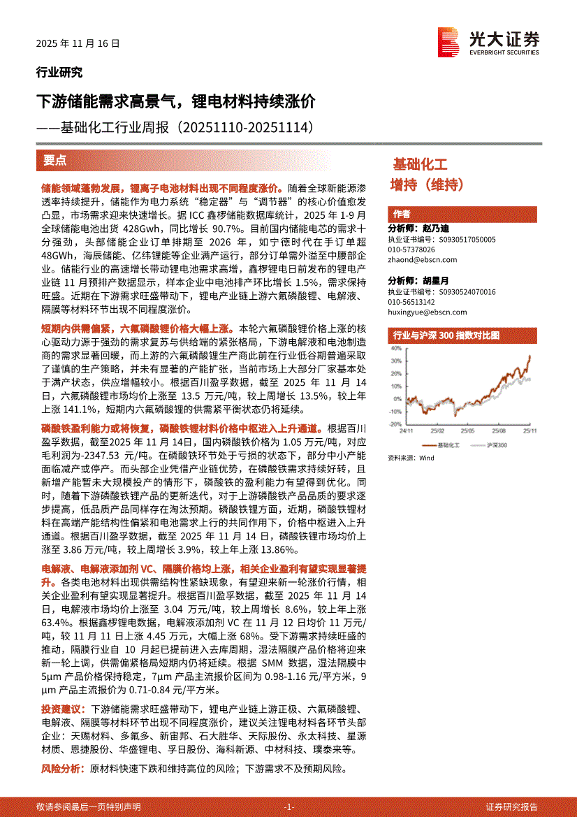基础化工行业:光大证券-基础化工行业周报:下游储能需求高景气,锂电材料持续涨价-251116