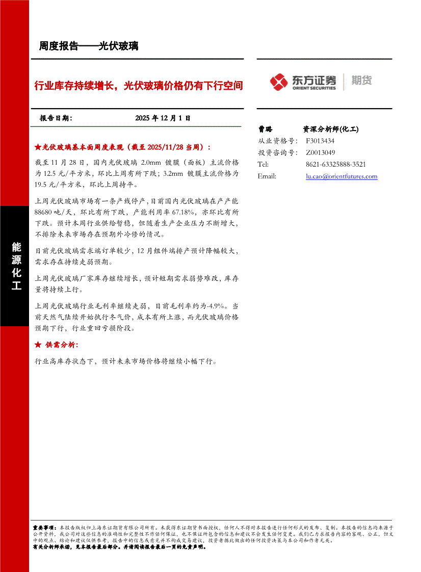 东证期货-光伏玻璃周度报告:行业库存持续增长,光伏玻璃价格仍有下行空间-251201