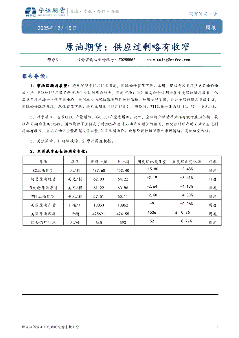 宁证期货-原油期货周报:供应过剩略有收窄-251215