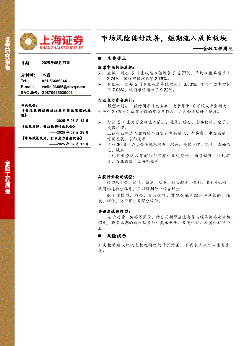 上海证券-金融工程周报:市场风险偏好改善,短期流入成长板块-250827