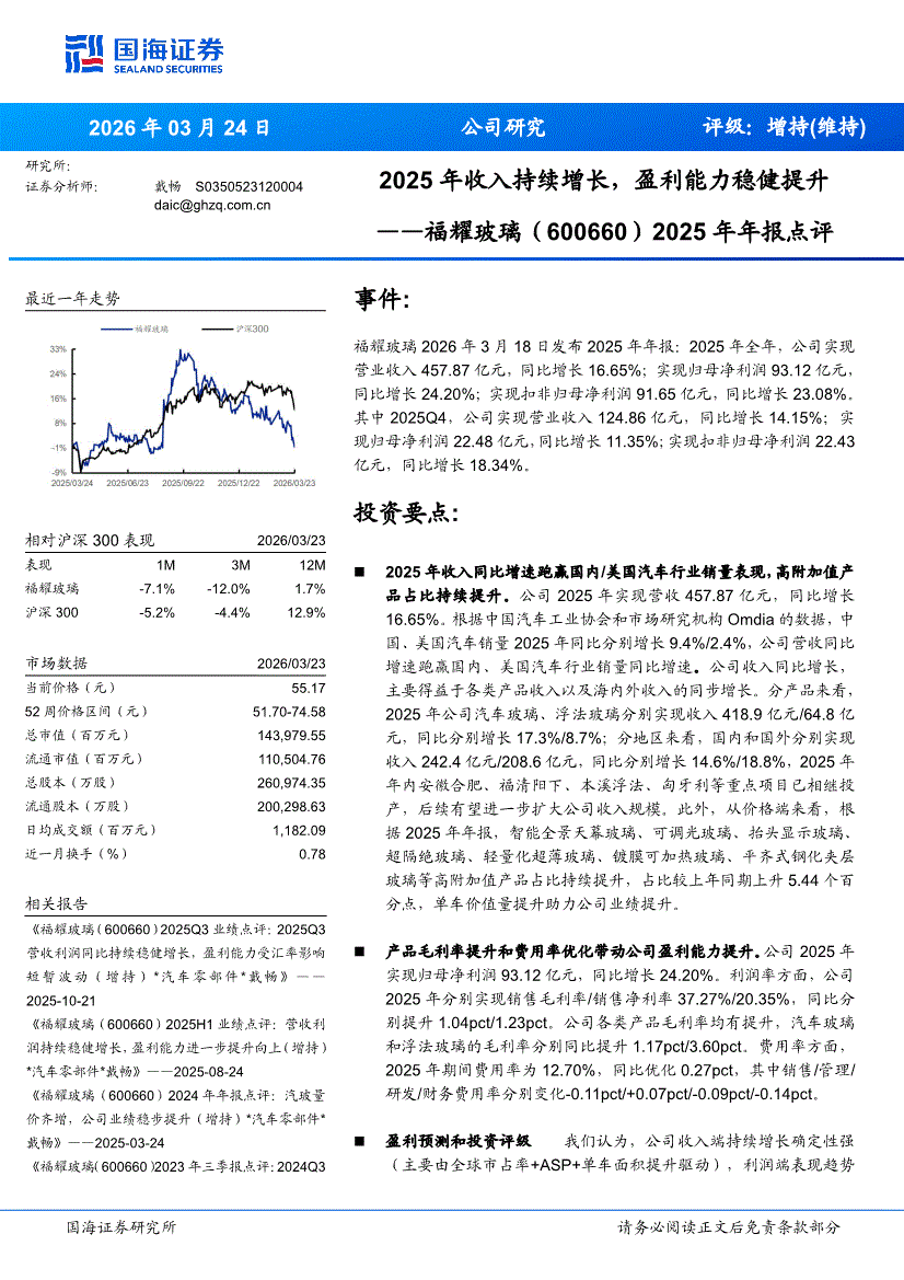 福耀玻璃:国海证券-福耀玻璃-600660-2025年年报点评:2025年收入持续增长,盈利能力稳健提升-260324