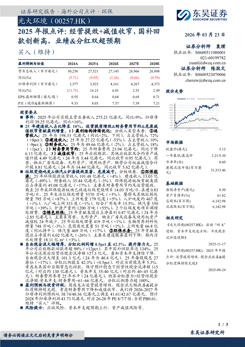 光大环境:东吴证券-光大环境-0257.HK-2025年报点评:经营提效+减值收窄,国补回款创新高,业绩&;分红双超预期-260323