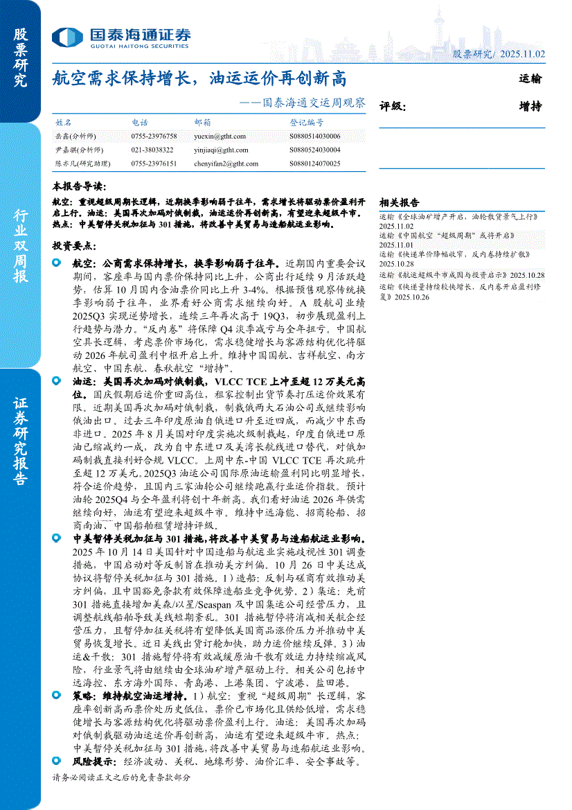 交运行业:国泰海通证券-交运行业周观察:航空需求保持增长,油运运价再创新高-251102