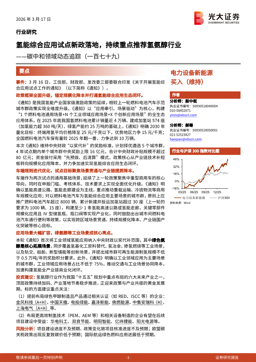 电力设备新能源行业:光大证券-电力设备新能源行业碳中和领域动态追踪(一百七十九):氢能综合应用试点新政落地,持续重点推荐氢氨醇行业-260317