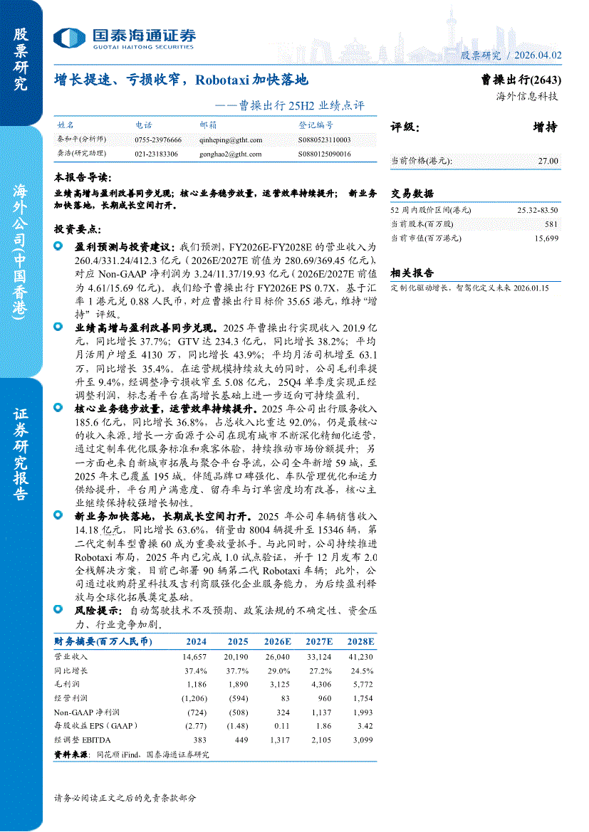 曹操出行:国泰海通证券-曹操出行-2643.HK-25H2业绩点评:增长提速、亏损收窄,Robotaxi加快落地-260402
