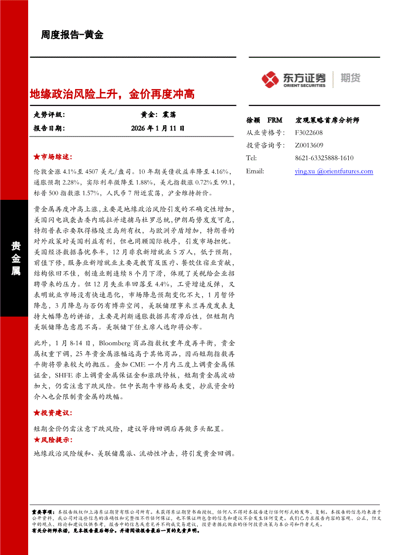 东证期货-黄金周度报告:地缘政治风险上升,金价再度冲高-260111