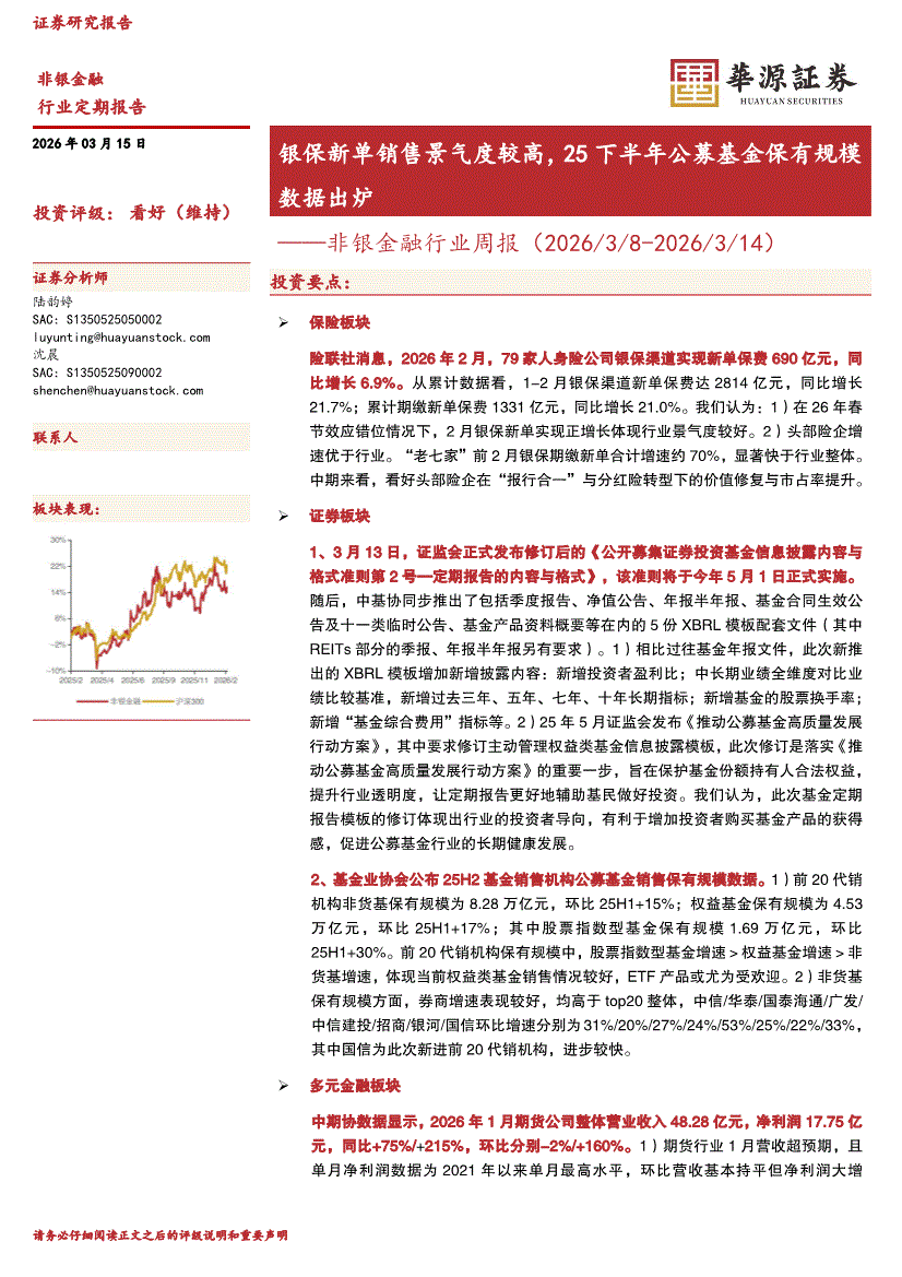 非银金融行业:华源证券-非银金融行业周报:银保新单销售景气度较高,25下半年公募基金保有规模数据出炉-260315
