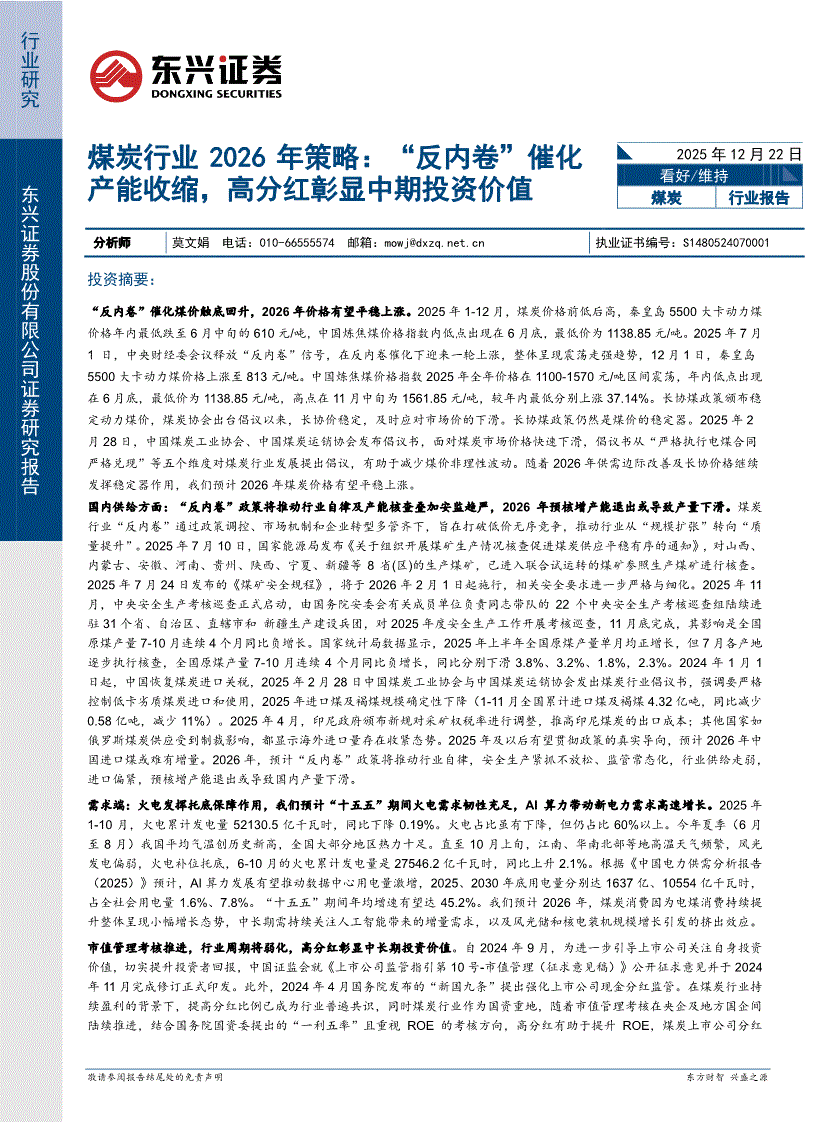 煤炭行业:东兴证券-煤炭行业2026年策略:“反内卷”催化产能收缩,高分红彰显中期投资价值-251222