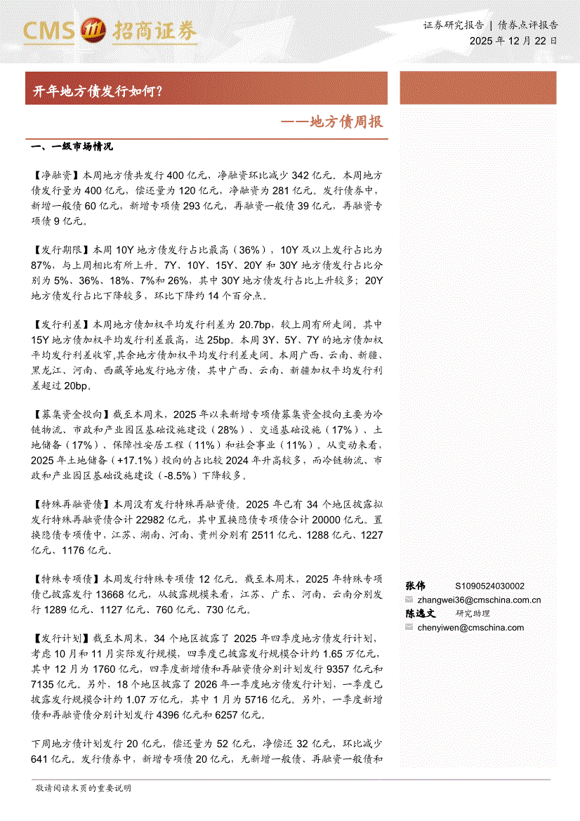 招商证券-地方债周报:开年地方债发行如何?-251222