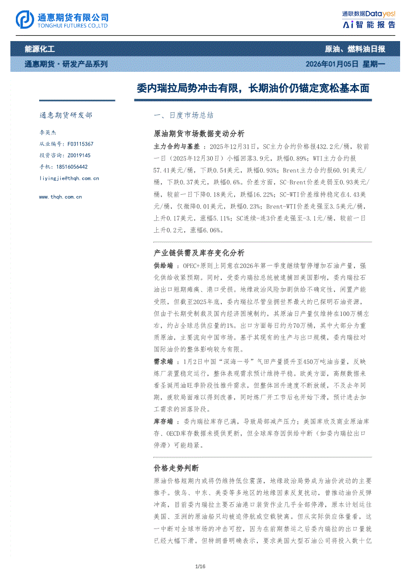 通惠期货-原油、燃料油日报:委内瑞拉局势冲击有限,长期油价仍锚定宽松基本面-260105