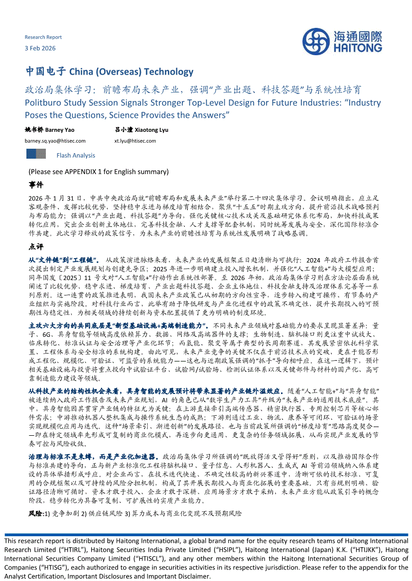 电子行业:海通国际-中国电子行业政治局集体学习:前瞻布局未来产业,强调“产业出题、科技答题”与系统性培育-260203