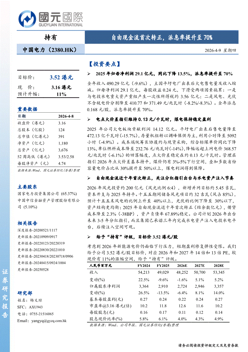 中国电力:国元国际-中国电力-2380.HK-自由现金流首次转正,派息率提升至70%-260409