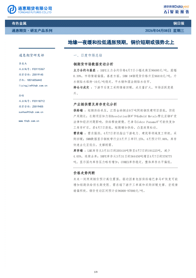 通惠期货-铜日报:地缘一夜缓和拉低通胀预期,铜价短期或强势北上-260408