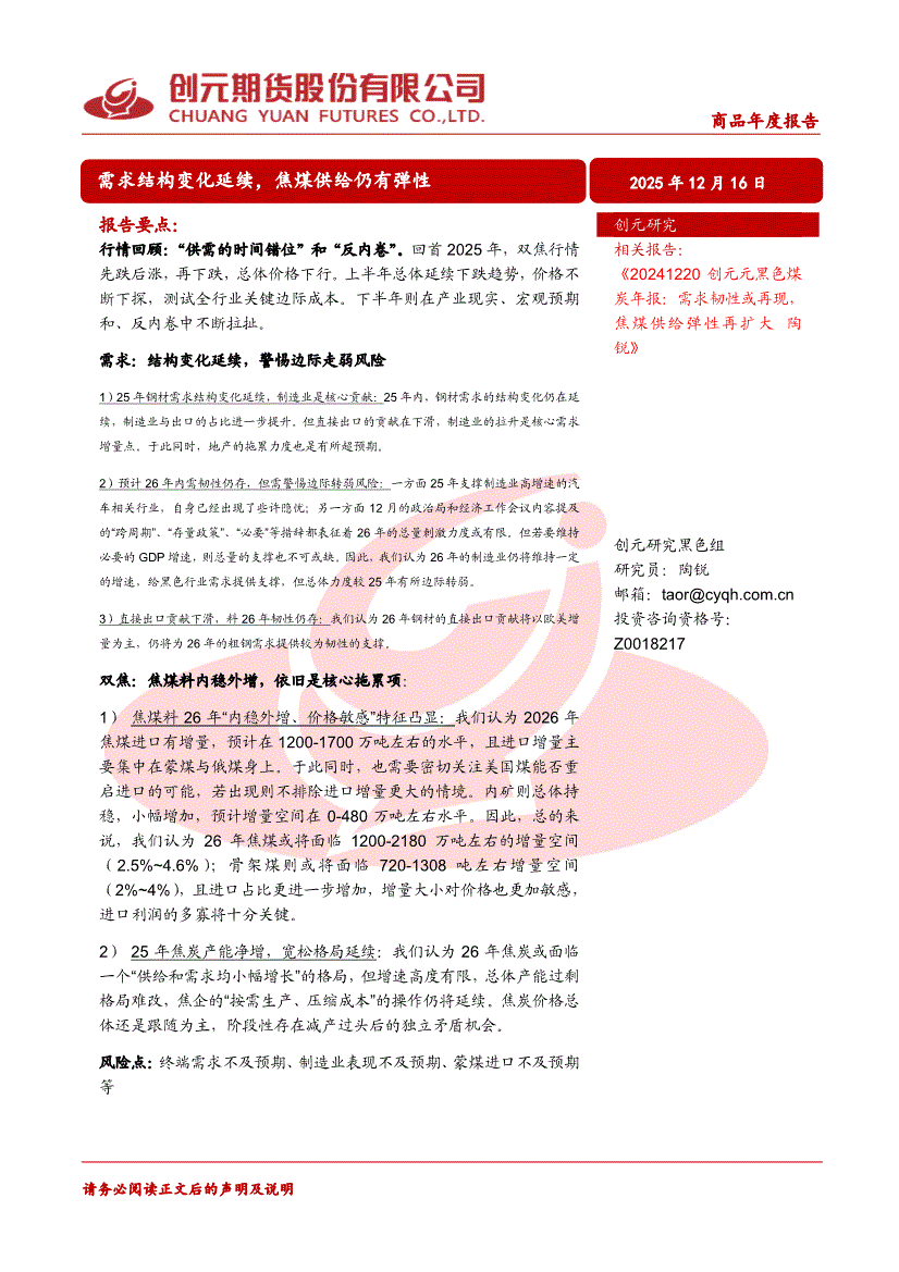 创元期货-商品年度报告:需求结构变化延续,焦煤供给仍有弹性-251216