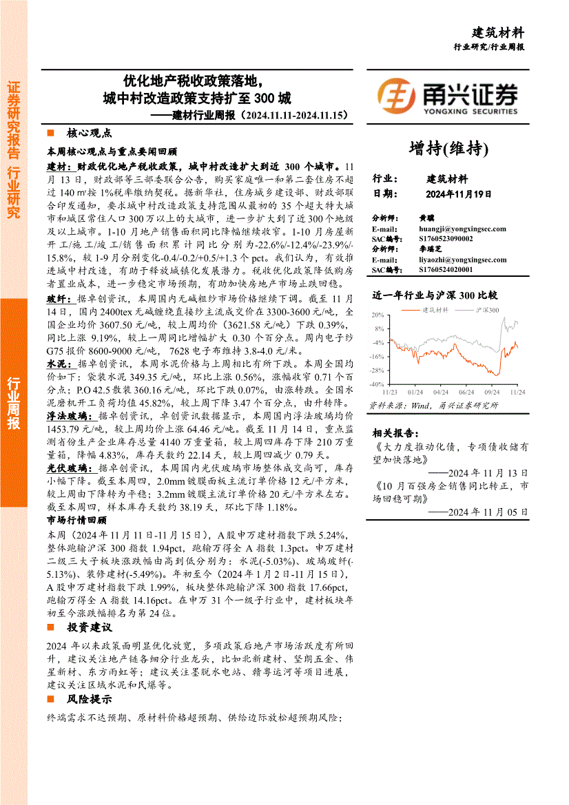 建材行业:甬兴证券-建材行业周报:优化地产税收政策落地,城中村改造政策支持扩至300城-241119
