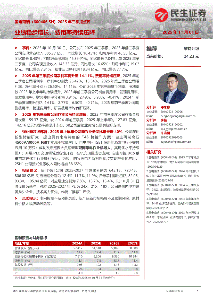 国电南瑞:民生证券-国电南瑞-600406-2025年三季报点评:业绩稳步增长,费用率持续压降-251101