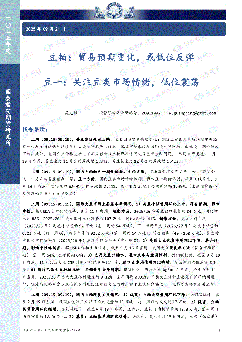 国泰君安期货-豆粕:贸易预期变化,或低位反弹,豆一,关注豆类市场情绪,低位震荡-250921