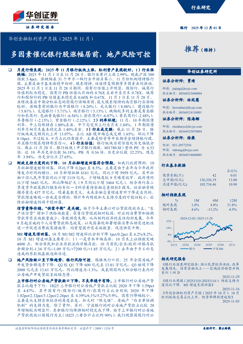 银行业:华创证券-银行业金融红利资产月报(2025年11月):多因素催化银行股涨幅居前,地产风险可控-251201
