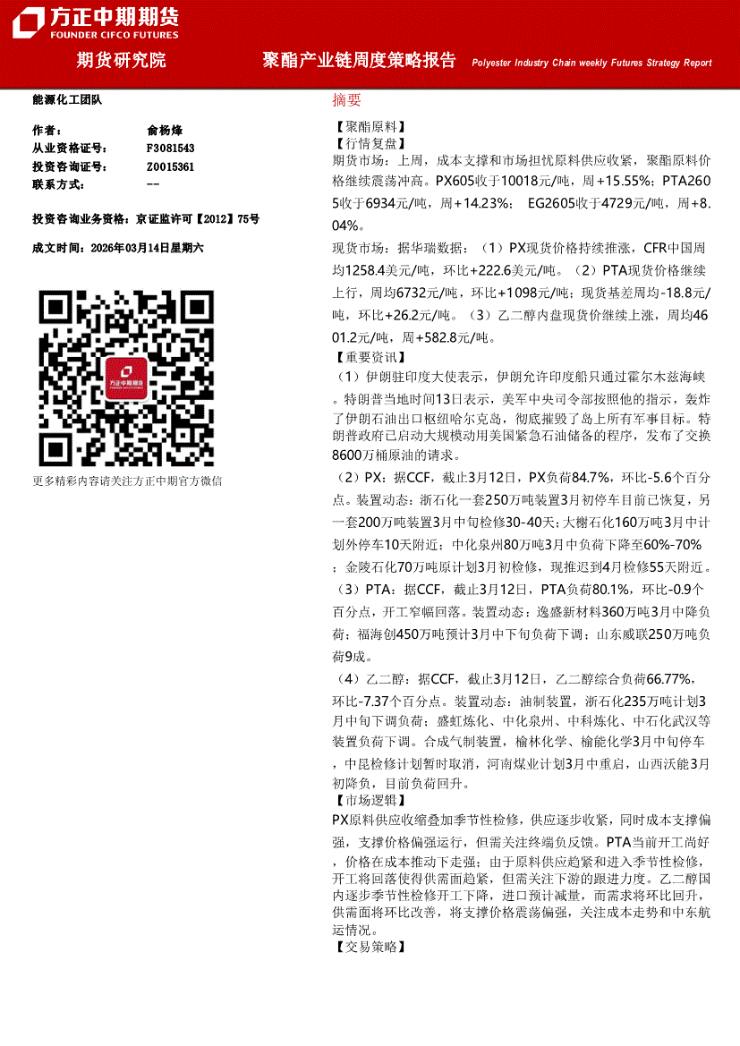 方正中期期货-聚酯产业链周度策略报告-260314