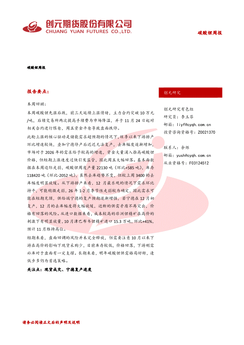 创元期货-碳酸锂周报:去库放缓-251123