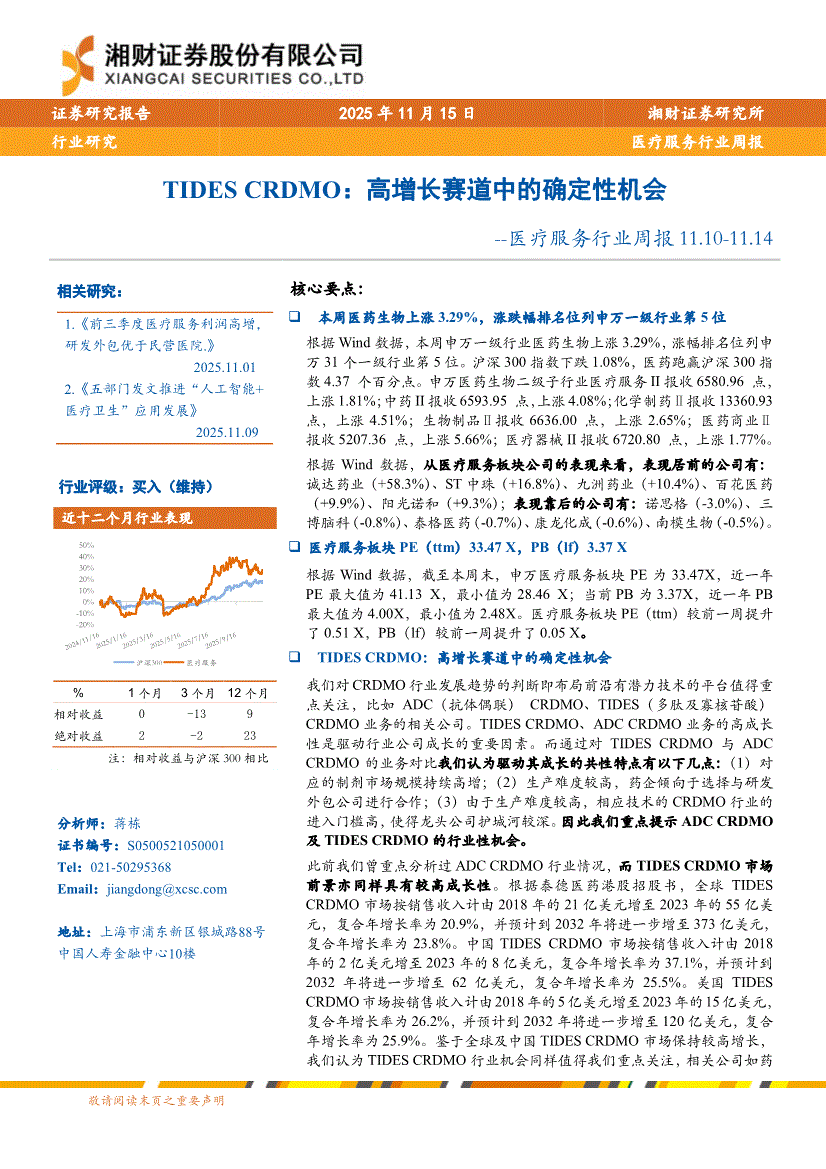 医疗服务行业:湘财证券-医疗服务行业周报:TIDES CRDMO,高增长赛道中的确定性机会-251115