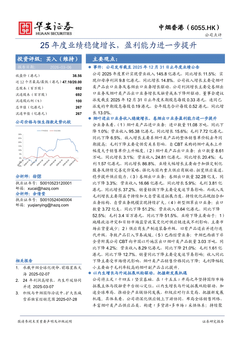 中烟香港:华安证券-中烟香港-6055.HK-25年度业绩稳健增长,盈利能力进一步提升-260306