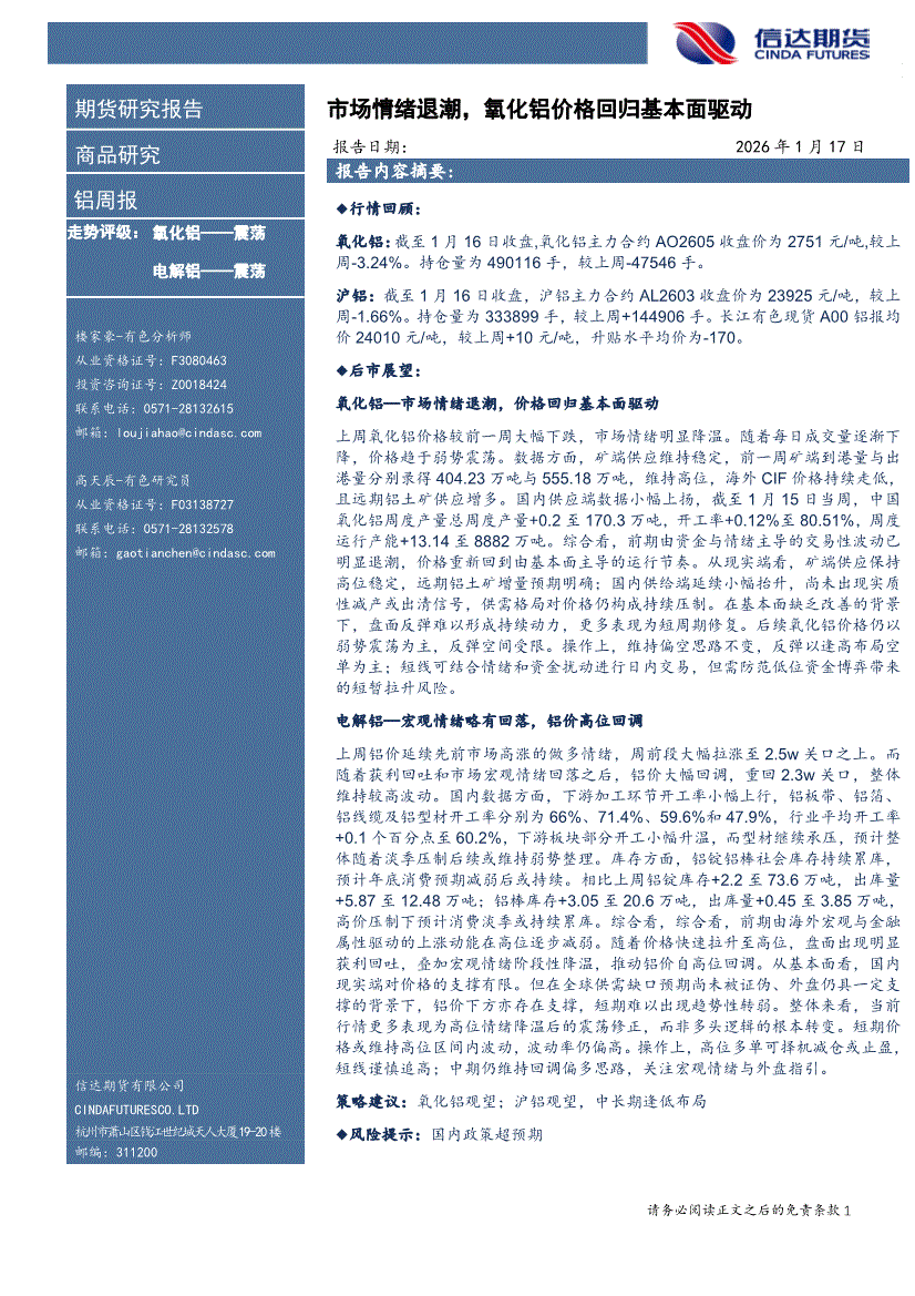 信达期货-铝周报:市场情绪退潮,氧化铝价格回归基本面驱动-260117