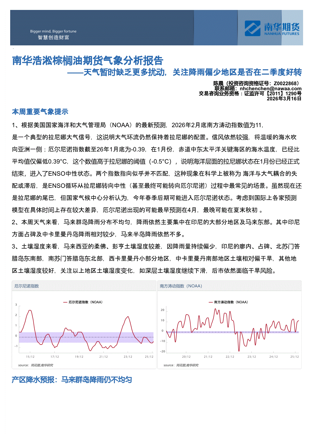 南华期货-浩淞棕榈油期货气象分析报告:天气暂时缺乏更多扰动,关注降雨偏少地区是否在二季度好转-260317