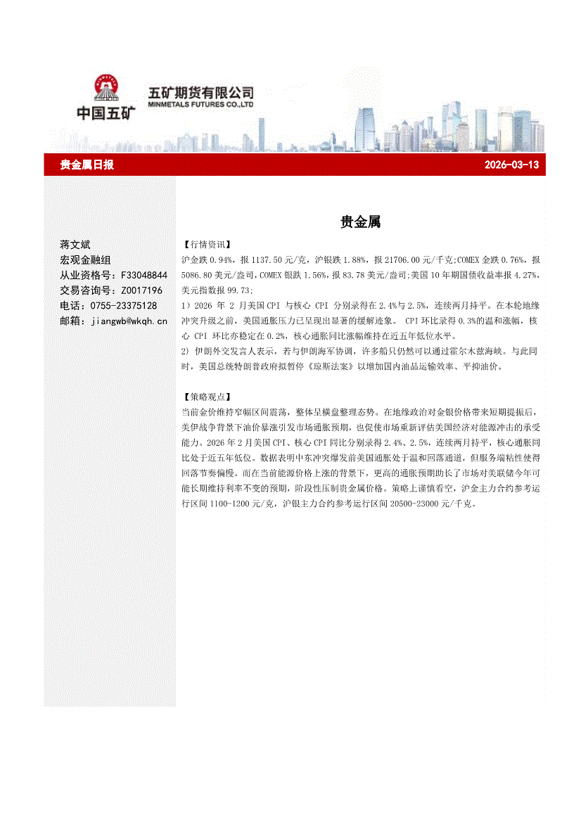 五矿期货-贵金属日报-260313