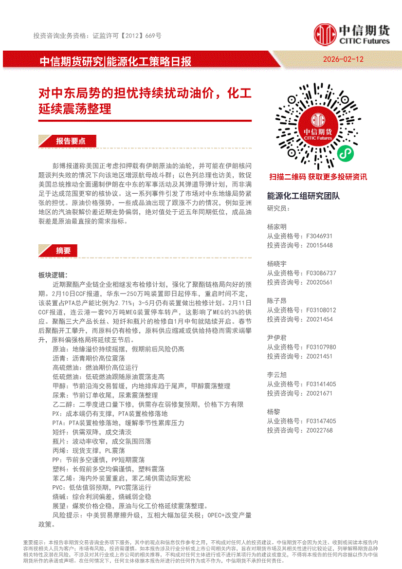中信期货-能源化工策略日报:对中东局势的担忧持续扰动油价,化工延续震荡整理-260212