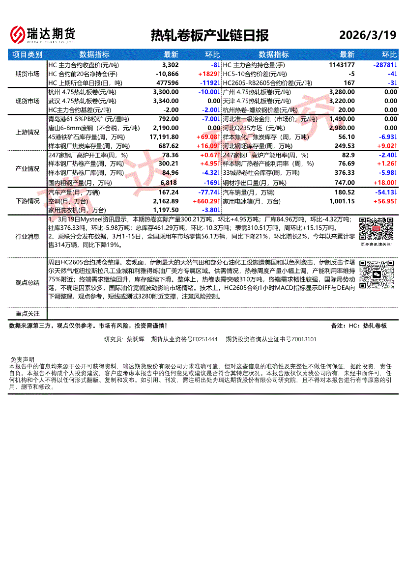 瑞达期货-热轧卷板产业链日报-260319