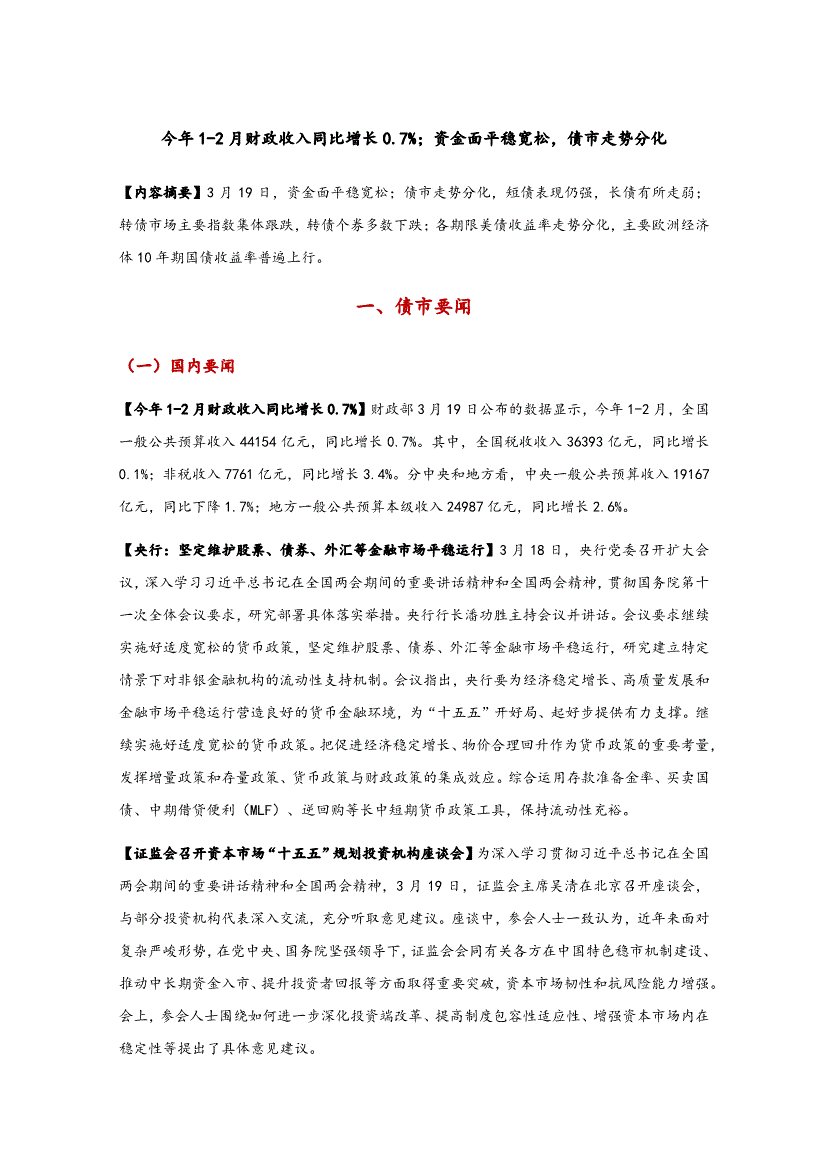 东方金诚-今年1~2月财政收入同比增长0.7%;资金面平稳宽松,债市走势分化-260320