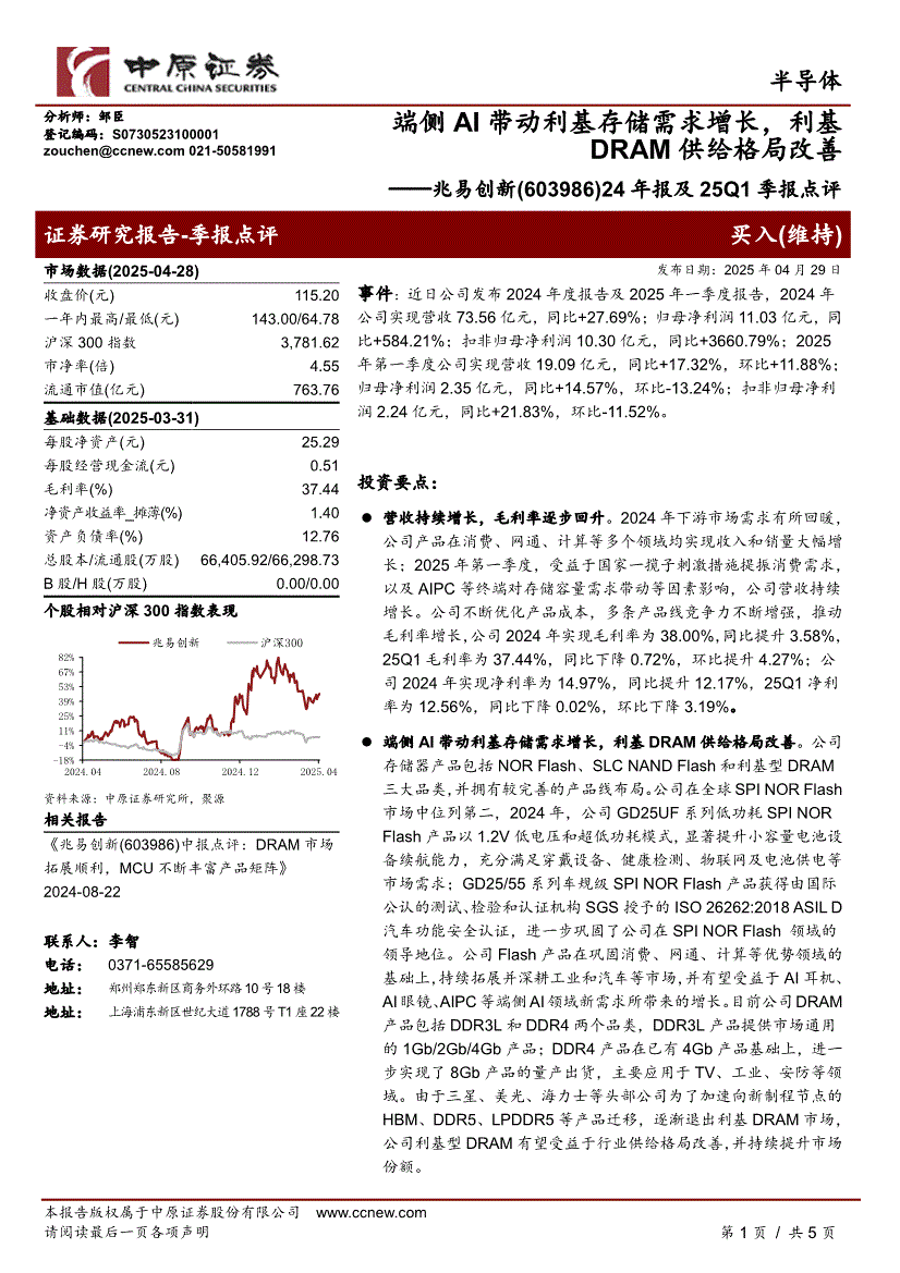 兆易创新:中原证券-兆易创新-603986-24年报及25Q1季报点评:端侧AI带动利基存储需求增长,利基DRAM供给格局改善-250429