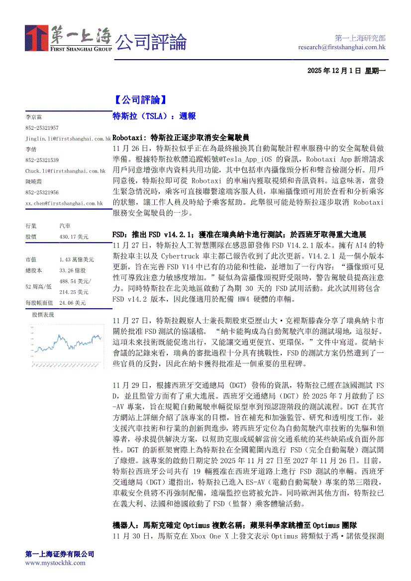 特斯拉:第一上海-特斯拉-TSLA.US-周报-251201