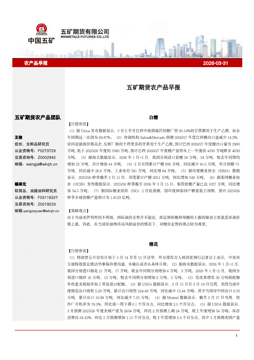 五矿期货-农产品早报-260331