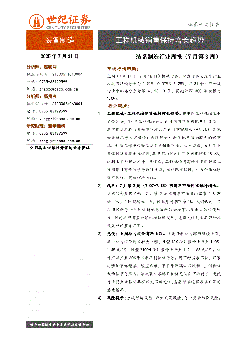 装备制造行业:世纪证券-装备制造行业周报(7月第3周):工程机械销售保持增长趋势-250721