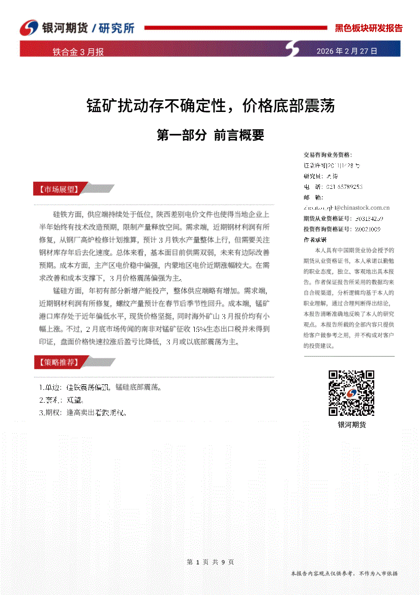 银河期货-铁合金3月报:锰矿扰动存不确定性,价格底部震荡-260227