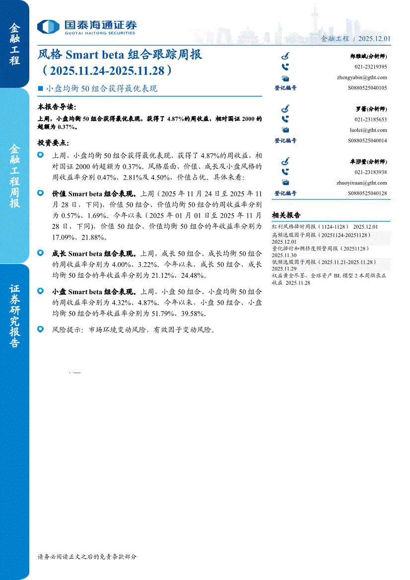 国泰海通证券-风格Smart beta组合跟踪周报:小盘均衡50组合获得最优表现-251201
