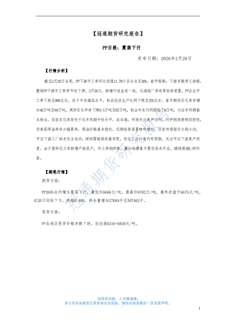 冠通期货-PP日报:震荡下行-260226
