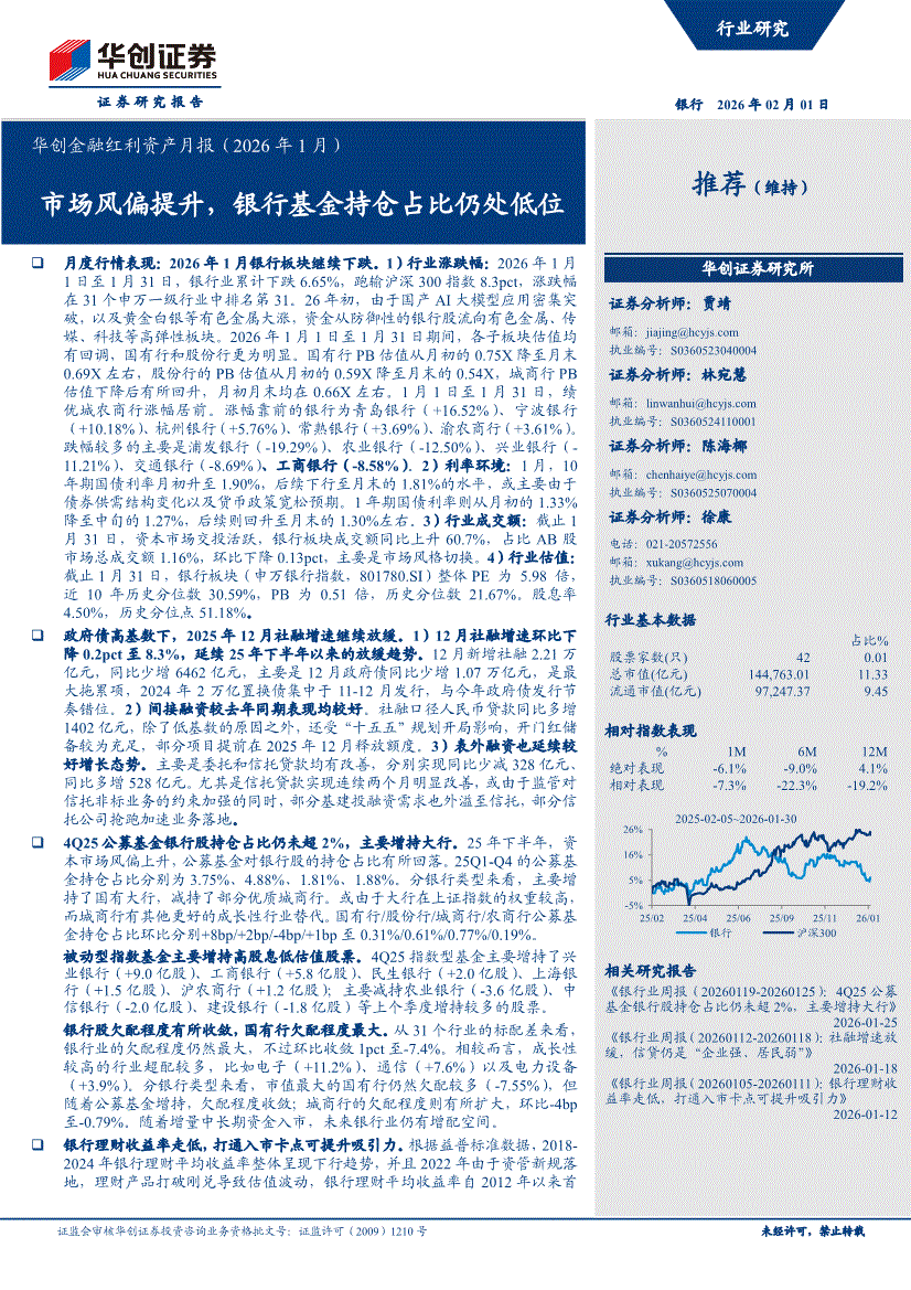 银行业:华创证券-银行业金融红利资产月报(2026年1月):市场风偏提升,银行基金持仓占比仍处低位-260201